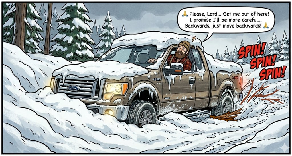 He hauled a dozen of those beaver-chewed branches back to the truck. He shoved them under the spinning tires, shifted into low gear, and prayed to the gods of torque. Those sticks bit into the ice, the truck lurched backwards and Hank climbed out of that ditch like a muddy phoenix rising from the snow.