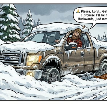 Folks, we almost lost him. Yesterday, Hank decided he was in a hurry—which usually means trouble—and tried to overtake a snow plow on the back road. Now, as any sane person knows, the plow always wins. Hank ended up nose-first in the ditch, buried in a drift so high he couldn't even open his door to see the sky.